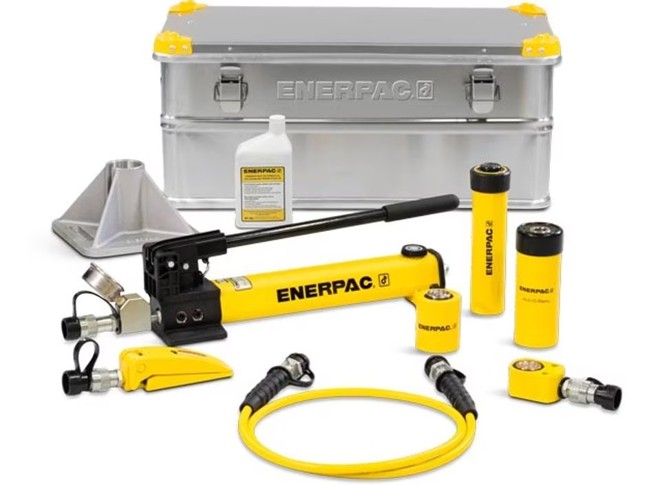 The Enerpac SC10HTB is a set of four hydraulic cylinders with a 10-ton capacity and handpump toolbox set. The multifunctional Enerpac 10-Ton Toolbox Set enhances job-site performance by providing a convenient and portable solution for a vast range of jobs onsite. The set includes a 10-ton capacity general-purpose cylinder, two 10-ton low-height cylinders, and a 10-ton hollow plunger cylinder for pulling jobs, a hand pump. It is designed to enhance job-site performance. It provides a convenient and portable solution for all your lifting, pushing or pulling requirements up to 10 tons. The industrial strength container keeps tools organized and secure. It is complete with a base plate for extra stability.