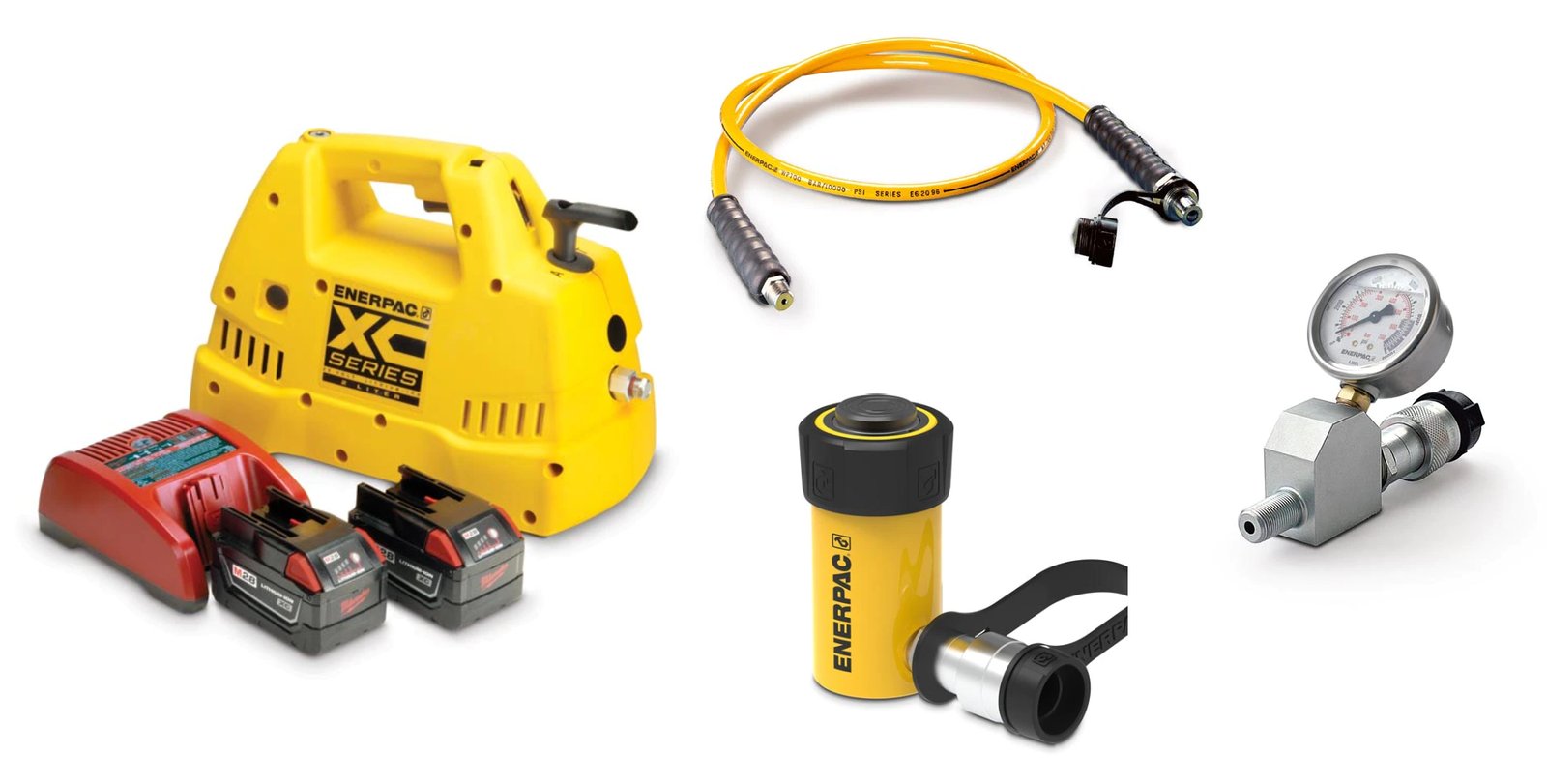 - Set includes general purpose hydraulic cylinder, cordless pump, 6ft safety hose, calibrated gauge with gauge adaptor