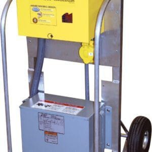 The complete assembly is ETL, cETL listed, NEMA 3R rated, with a 15KVA transformer, and supports input voltages of 480V and 600V. Additional capabilities include single and three phase operation, flexible main power configurations , job-site friendly breaker panel access, wheels or skid transportability, built-in forklift access and a heavy duty welded aluminum frame.