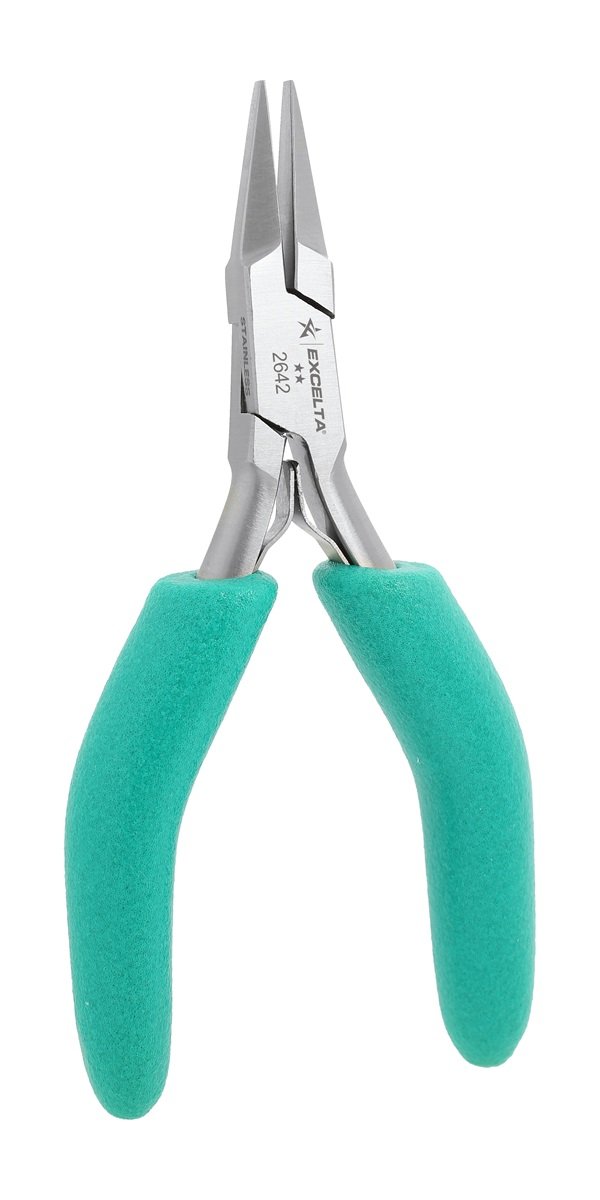 The Excelta 2642 small flat nose pliers have an overall length of 4.75″. It is made of stainless steel and features dual leaf springs for smooth action. The AntiStatic grips are soft cushioned foam and have a surface resistivity of 10¹⁰ ohms/sq.
