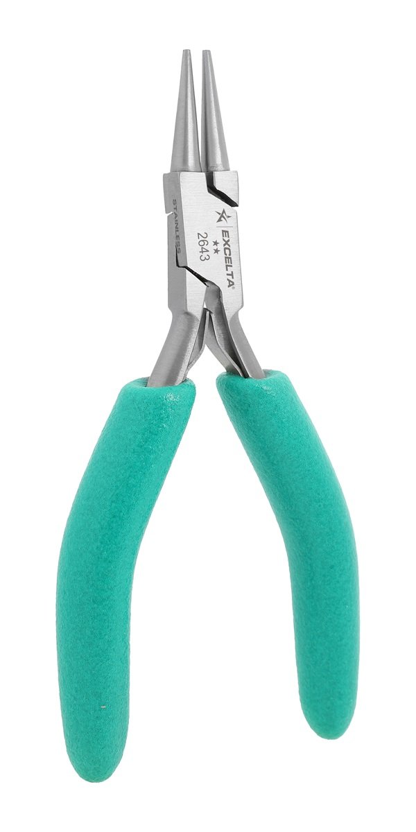 The Excelta 2643 small round nose pliers have an overall length of 4.75″. It is made of stainless steel and features dual leaf springs for smooth action. The Anti-Static grips are soft cushioned foam and have a surface resistivity of 10¹⁰ ohms/sq.