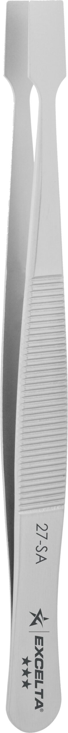 The Excelta 27-SA straight flat-tipped tweezers with .25″ x .02″ tips are very useful when straightening components or lead wires. It is made of anti-magnetic Neverust stainless steel and features serrated handles for added control.