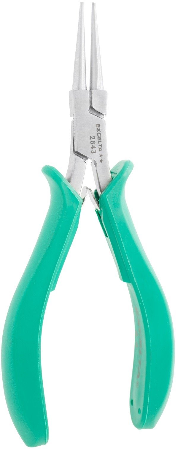 The 2843 medium round nose pliers have an overall length of 5.75″. It is made of stainless steel and features an ergonomically molded antimicrobial Anti-Static grip (10¹⁰ohms/sq surface resistivity) with dual leaf springs.