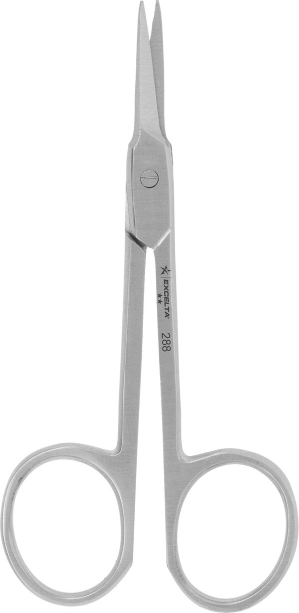 The Excelta 288 two-star short straight fine blade scissors are stainless steel and have short, thin cutting blades for delicate work and close tolerance cutting. The overall length is 3.25″ and the blade length is .75″.