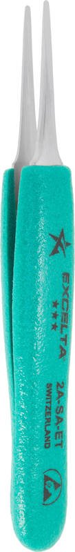 The Excelta 2A-SA-ET straight-tapered flat-pointed tweezers are designed for handling labels or SMD components. The overall length is 5.25″ and it is made of anti-magnetic Neverust stainless steel. It features our Ergo-Tweeze soft-cushioned Anti-Static grips (10¹⁰ ohms/sq surface resistivity), which also protect the user from heat.