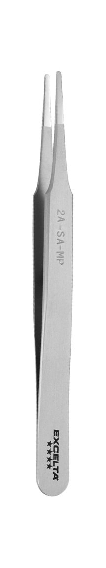 The Excelta 2A-SA-MP straight tapered flat pointed tweezer is designed for handling labels or SMD components. The tips have been mirrored polished to avoid marring delicate components. The overall length is 4.75” and it is made of anti-magnetic Neverust stainless steel. The tips measure 0.059” wide by 0.008” high.