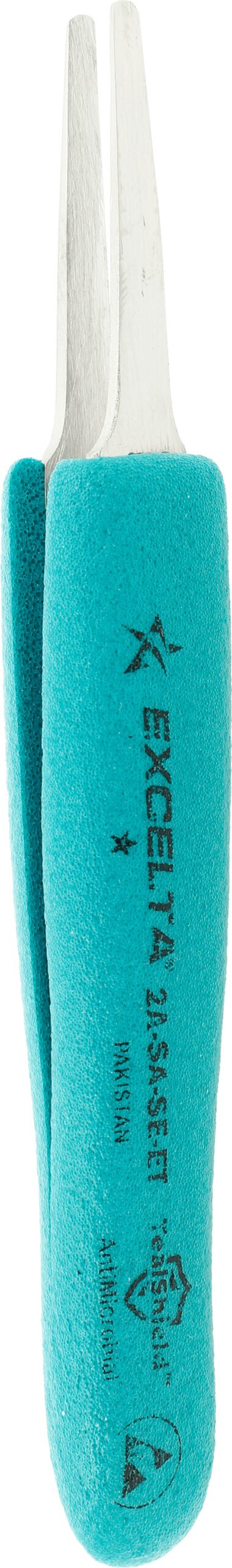 The Excelta 2A-SA-SE-ET straight-tapered flat-pointed tweezers are designed for handling labels or SMD components. The overall length is 5.25″ and it is made of anti-magnetic stainless steel. It features our Ergo-Tweeze soft-cushioned Anti-Static grips (10¹⁰ ohms/sq surface resistivity), which also protect the user from heat.
