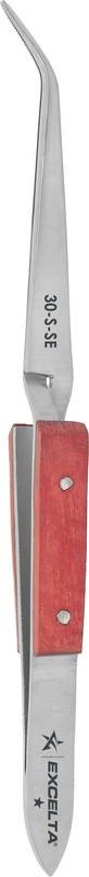 The Excelta 30-S-SE 45-Degree angled tip reverse action angled tweezers have fiber handles to protect them from heat. At rest, the tool is closed. It is ideal for dipping components in a solder bath. It is made of stainless steel and has a .08″ wide x .05″ high broad serrated tip.