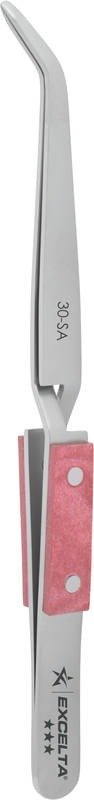 The Excelta 30-SA 45-Degree angled tip reverse action tweezers have fiber handles to protect them from heat. At rest, the tool is closed. It is ideal for dipping components in a solder bath. It is made of stainless steel and has a .08″ wide x .05″ high broad serrated tip.