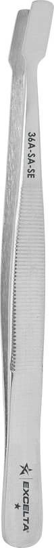 The Excelta 36A-SA-SE 45-degree offset broad-tipped tweezer is ideal for picking flat objects off a flat surface. The tips are 0.25″ x 0.02″. It features serrated handles for better control. It is made of anti-magnetic stainless steel.