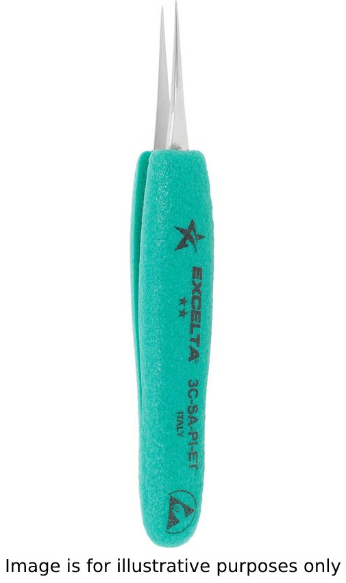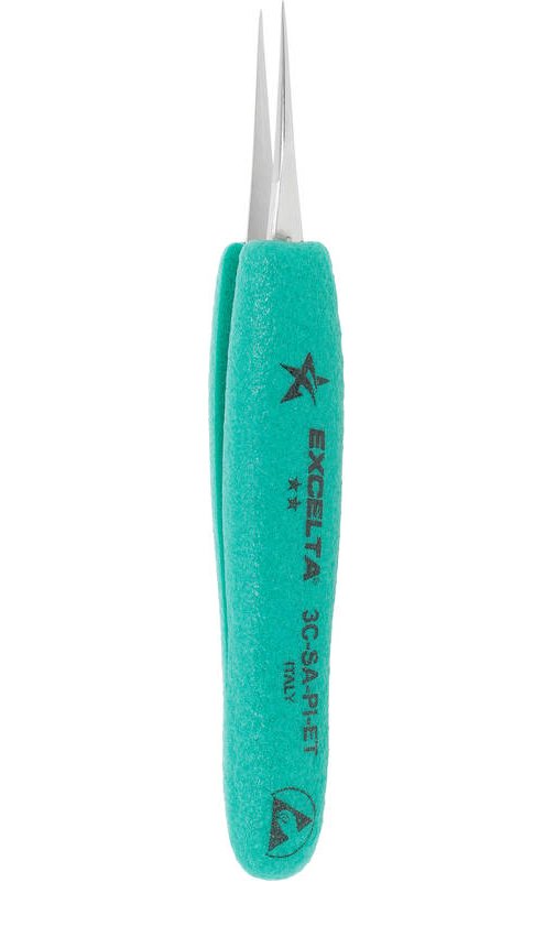 The Excelta 3C-SA-PI-ET2 straight very fine precision pointed tweezers are designed for work under magnification. The overall length is 4.75″ and it is made of anti-magnetic stainless steel. It features our Ergo-Tweeze soft-cushioned Anti-Static grips (10¹⁰ ohms/sq surface resistivity), which also protect the user from heat, with a 1.1″ diameter between fingers for the maximum level of ergonomics.
