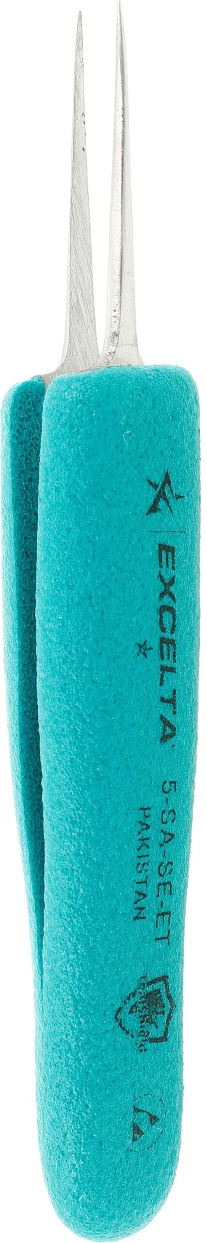 The Excelta 5-SA-SE-ET 1 star straight tapered ultra-fine pointed tweezers is primarily used for microscopy. The style 5 has the finest points available. The overall length is 4.75″. It is made of anti-magnetic stainless steel. It features Ergo-Tweeze soft cushioned Anti-Static grips (10¹⁰ ohms/ sq surface resistivity), which also protect the user from heat.