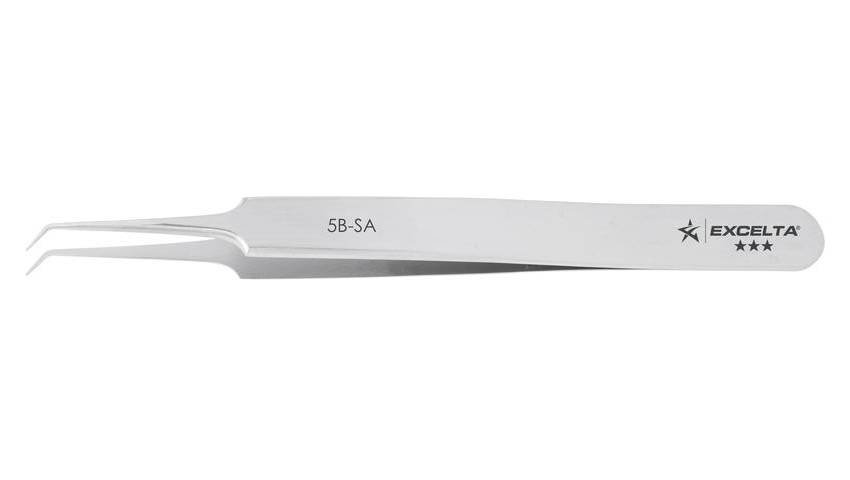 The Excelta 5B-SA 45° bent and tapered ultra-fine pointed tweezers are primarily used for microscopy. The bent tip offers access in very difficult areas. It is made of anti-magnetic Neverust stainless steel.