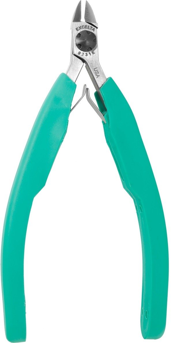 The Excelta 9231E five-star Lazer Line, small oval, the optimum flush cutter has a cutting capacity of 0.040″ soft wire. It is made of carbon tool steel with induction hardened cutting blades to RHC 63-65. The CNC machining allows the Lazerlok joint surfaces to be perfect to allow for long life. The dual leaf springs provide smooth action. The Anti-Static grips are soft cushioned foam and have a surface resistivity of 10¹⁰ ohms/sq.