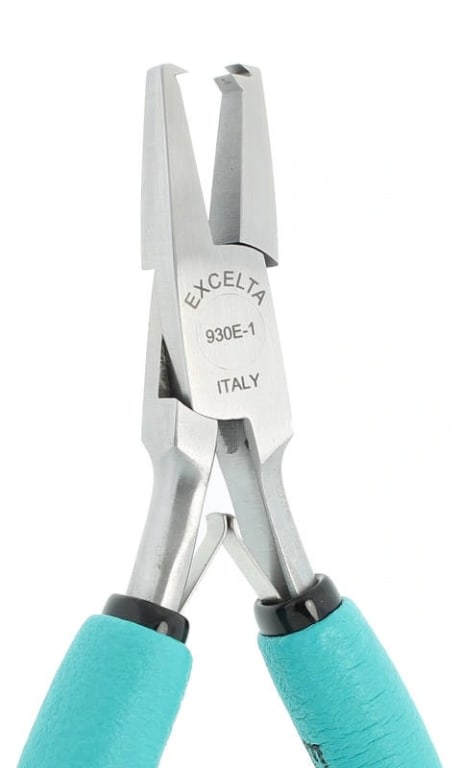 The Excelta 930E-1 5.5″ anti-shock shear cutter/bender cuts component leads at .060″ then bends the lead keeping the component in place when soldering. Recommended cutting capacity is 20AWG (.032″ diameter). It features soft cushioned ergonomic Anti-Static grips (10¹⁰ ohms/sq surface resistivity) with dual leaf springs for smooth action.