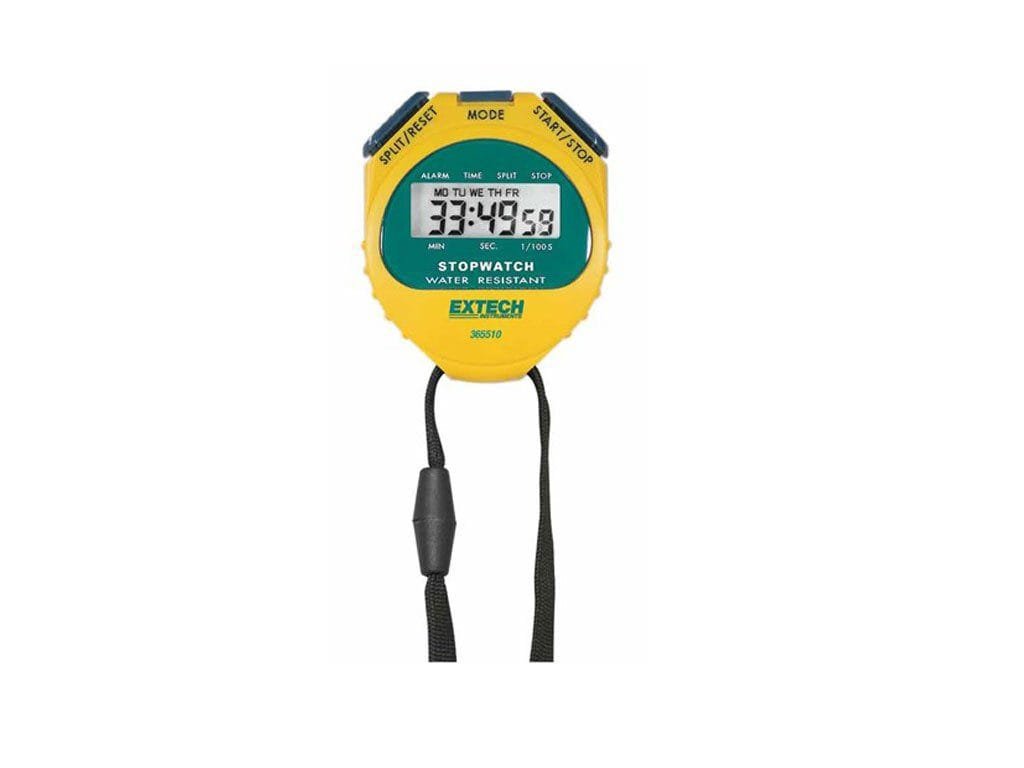Sporty, yellow digital stopwatch with large LCD counts up to 23 hours, 59 minutes, 59 seconds with ±3 second/day accuracy and 1/100-second resolution.