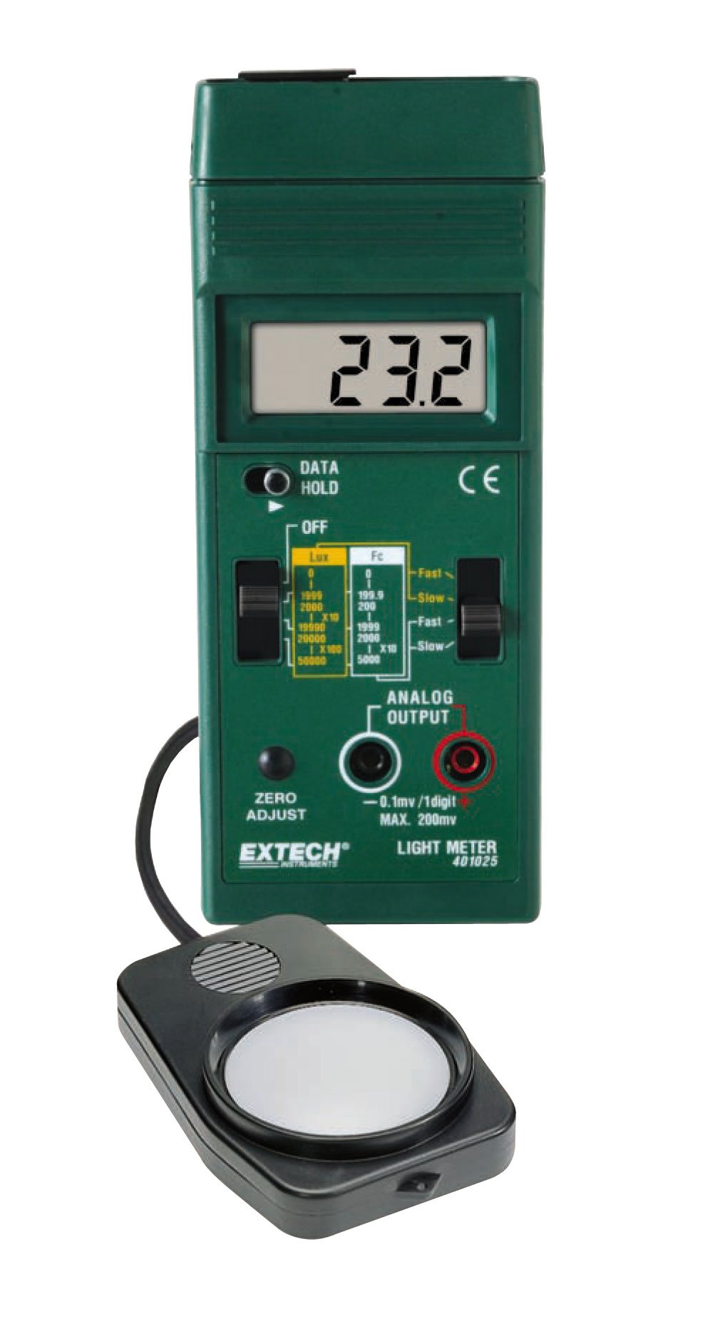 A light meter measures the amount of visible light, also known as illumination, in a given area. For many meter brands, including Extech, illumination is expressed in units of measure called Lux (for metric) and Foot candles (used in the US). To use an Extech light meter, the sensor is placed on a tabletop or other surface in the area to be measured and the light level reading is indicated on the meter’s display.