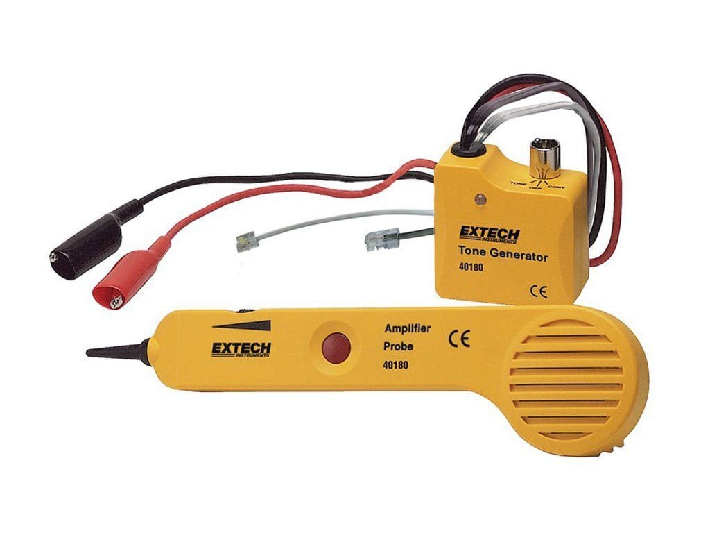 The Extech 40180 tone generator and amplifier probe kit is a heavy duty kit with audible tone that allows you to easily identify wires or cables. The insulated inductive probe prevents you from shorting out conductors, and testing capabilities include wire trace, continuity, clear / busy / ringing line, and tip / ring identification.
