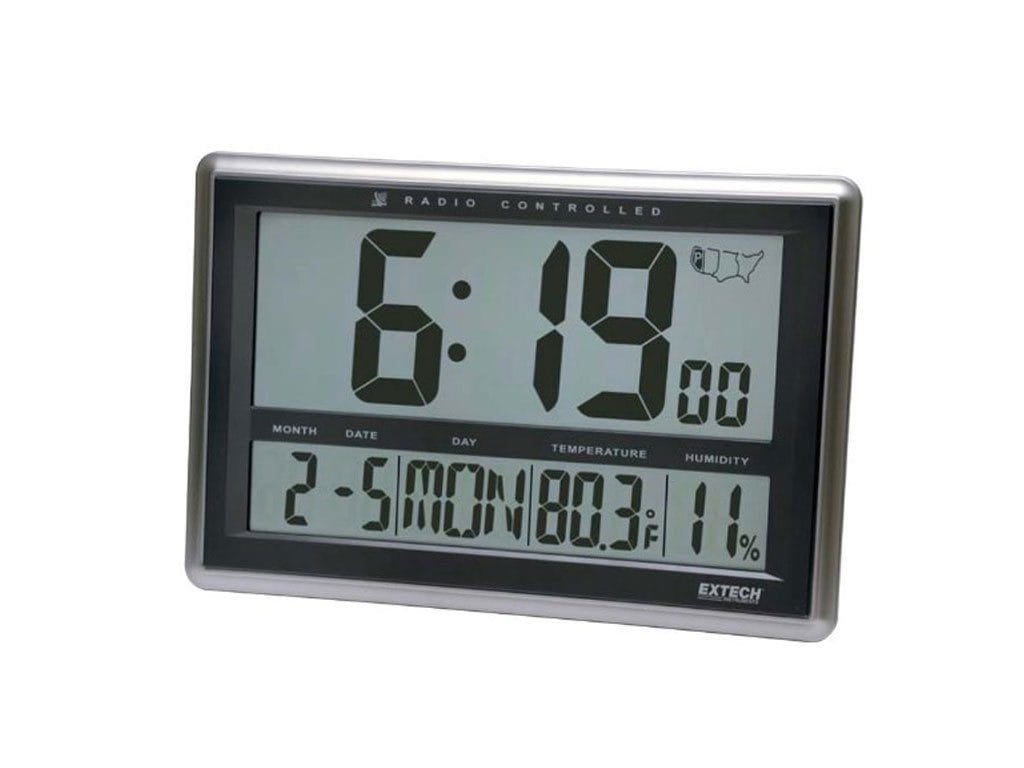 The super large 4.3-inch (109mm) digit clock display can be viewed from a distance. A signal indicator displays radio signal strength in 3 levels to indicate successful synchronization. The clock automatically adjusts for daylight savings time (DST). The Hygro-Thermometer measures temperature from 23 to 122 degrees F (-5 to 50 degrees C) and Humidity from 20 to 90 percent RH with accuracies of ±2 degrees F, ±1 degrees C and ±6 percent RH. Additional features include: Alarm Clock function, switchable degrees F/ degrees C, and a built-in stand for desktop use (clock may also be wall mounted).