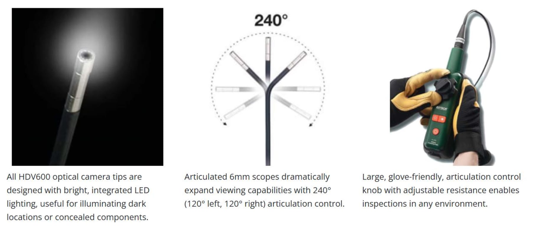 From the makers of the best test and measurement instruments comes a new generation of high-definition inspection cameras. Introducing the HDV600 videoscopes, designed for ruggedness, upgradable versatility, and high-definition clarity. HDV600 videoscopes feature a large color display, SD memory, LED illuminated handset probes, and glove-friendly controller handsets. Inspect more, see more, and find more with the Extech HDV600 VideoScope Series.
