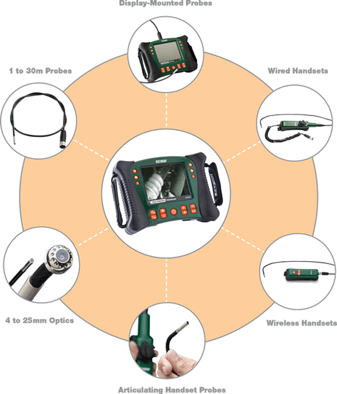 Access impressive versatility with a range of options designed to ensure the right scope for the job, without sacrificing upgrade ability. In addition to probes which connect directly to the main display unit, handset-mounted probes make it easier than ever to inspect difficult-to-access areas.