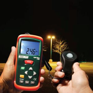 Insufficient lighting can create security risks or result in OSHA crackdowns. The Extech LT300 light meter can determine whether you have adequate illumination to protect workers, students, visitors, patients or attendees of different venues. This handheld instrument measures up to 40,000 Fc (or 400,000 Lux) utilizing a remote light sensor connected via 12 in. coiled cable (expandable to 24 in.). A prominent LCD readout displays a digital calculation and complementary analog bar graph for quick, reliable assessments. Complete with 9V battery, light sensor with protective cover, protective holster, and soft case.