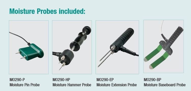 The MO290-RK kit includes an MO-P1 pin probe, MO290-HP hammer probe, MO290-EP deep wall probe and an MO290-BP baseboard probe for all contact moisture readings. MO290 also incorporates a pinless sensor that detects moisture in wood and building materials with virtually no surface damage, as well as a built-in IR thermometer for taking non-contact temperature readings.