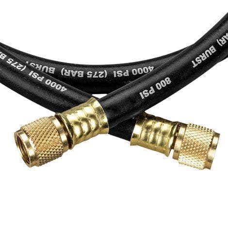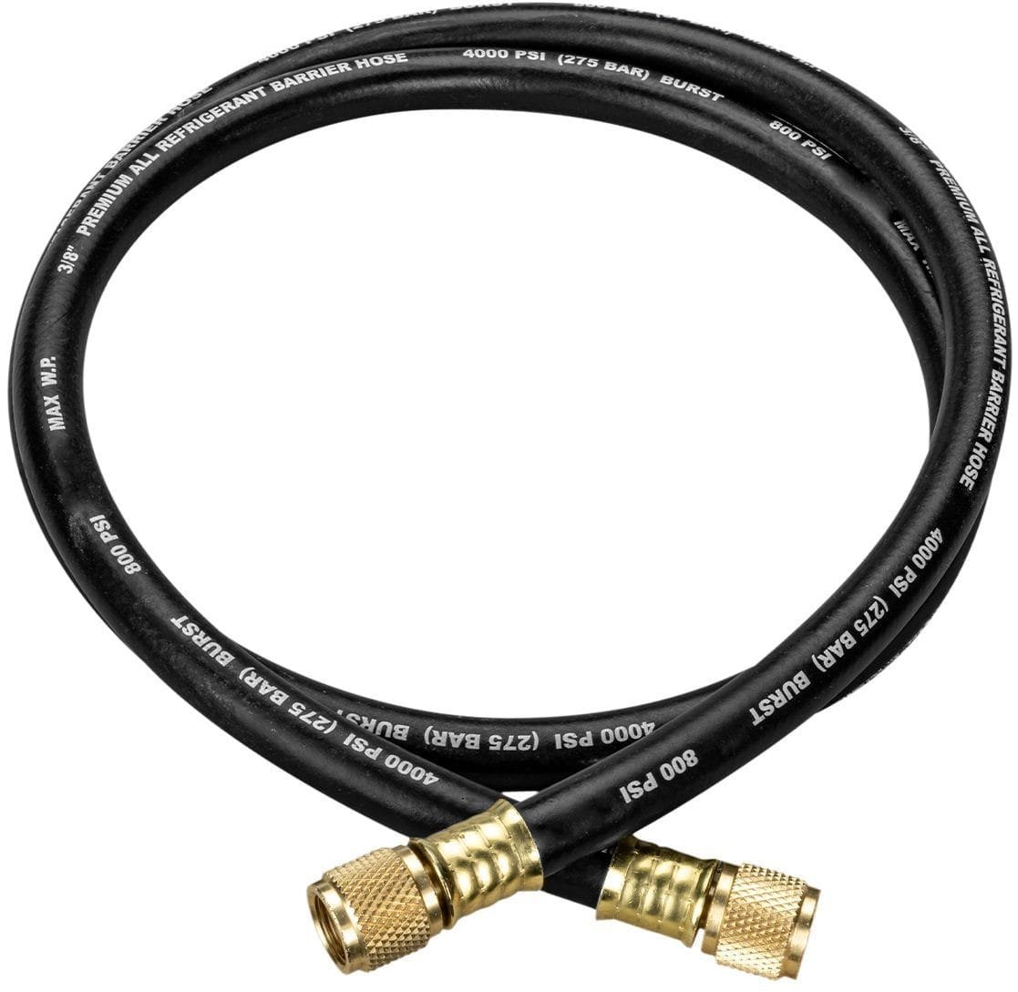 Rugged full-ring triple crimp vacuum hose for rapid evacuation. This hose is 5 ft (1.5m) in length and features 3/8” x 3/8” fittings. A2L compatible and has a permeation barrier that meets SAE J2196. Working pressure of 800 psi and burst pressure of 4000 psi.