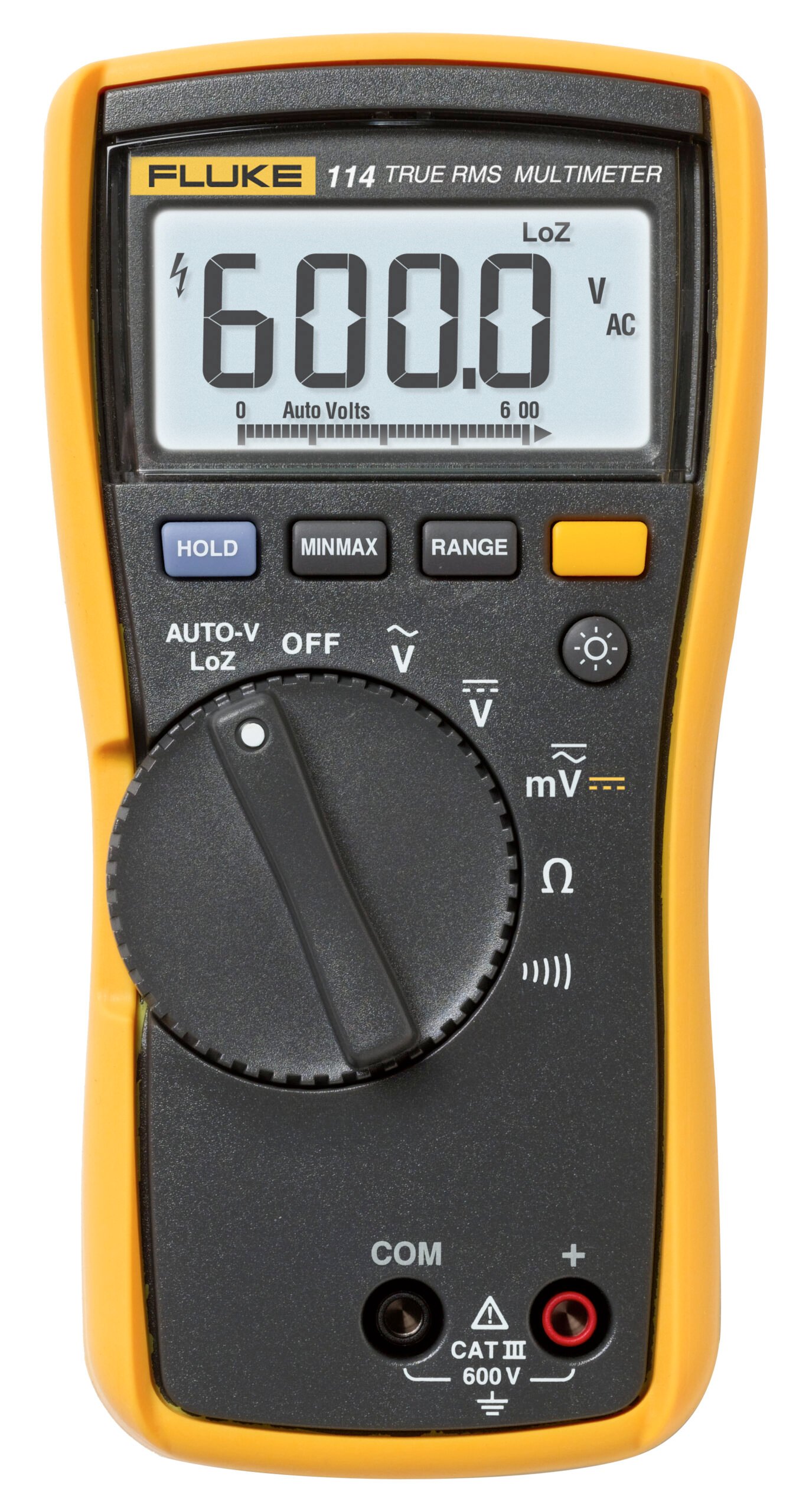 Designed for easy one-handed operation, the compact Fluke 114 True RMS digital multimeter is the perfect troubleshooting tool for go/no go testing. Its AutoVolt capability automatically switches to measure AC or DC voltage, whichever is present. You can use the LoZ function to identify ghost voltage and prevent false readings.