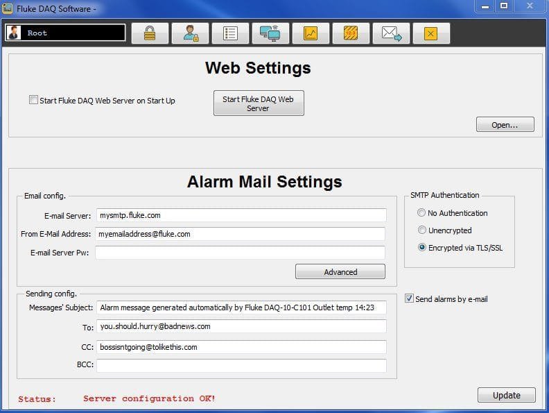 Alarm pages. The Fluke DAQ alarm page gives the operator a full page view of historical and present alarm conditions. The operator has full control over alarm acknowledgement function and can select filters for viewing specific channel alarm history by channel or date range. Alarm conditions may also be emailed to users for immediate notification of system status.