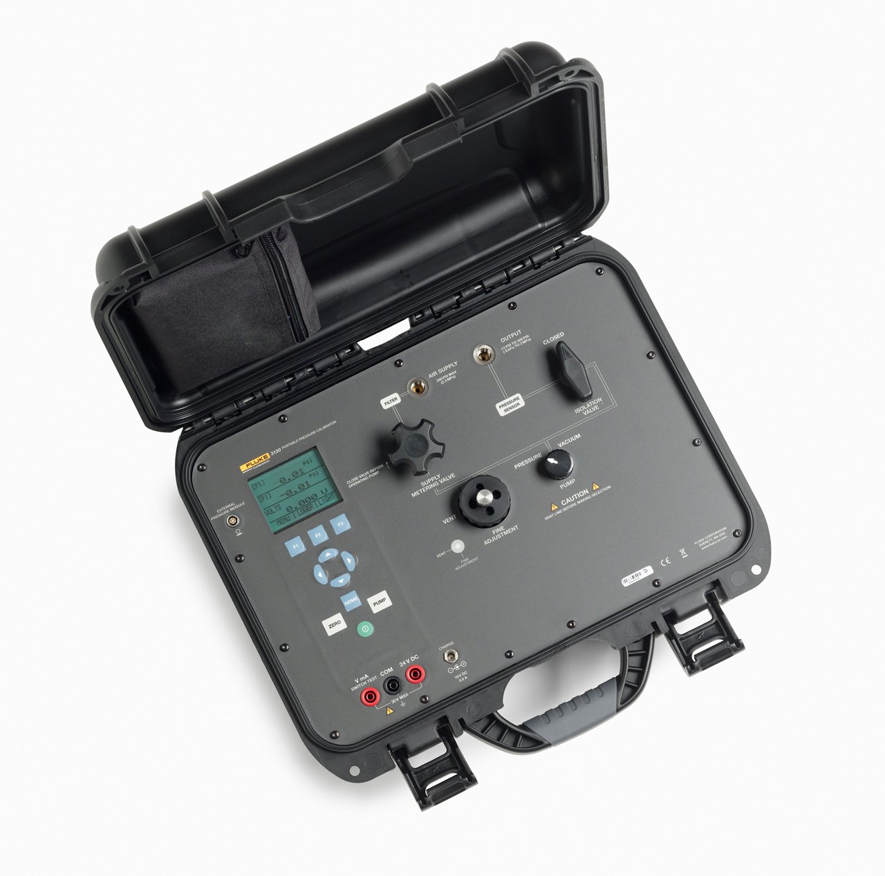 | Unique Features | •Measure and generate pressures from vacuum to 2 MPa (300 psi, 20 bar) •Internal pump can generate vacuum to -80 kPa (-12 psi, -0.8 bar) or pressure to 2 MPa (300 psi, 20 bar) •Supply pressure connection allowing the use of external gas supply up to 2 MPa (300 psi, 20 bar) •Includes variable volume for fine adjustment of pressures •Pressure measurement accuracy of 0.025 % reading ± 0.01 % FS •Electrical measurement and 24 volt supply for close looped calibrations •Measure or generate 4 to 20 mA •Measure 0 to 30 V dc •Powered by internal, high capacity, NiMH battery or universal ac mains adapter •Compatible with Fluke 700P and 750P Pressure Modules |
