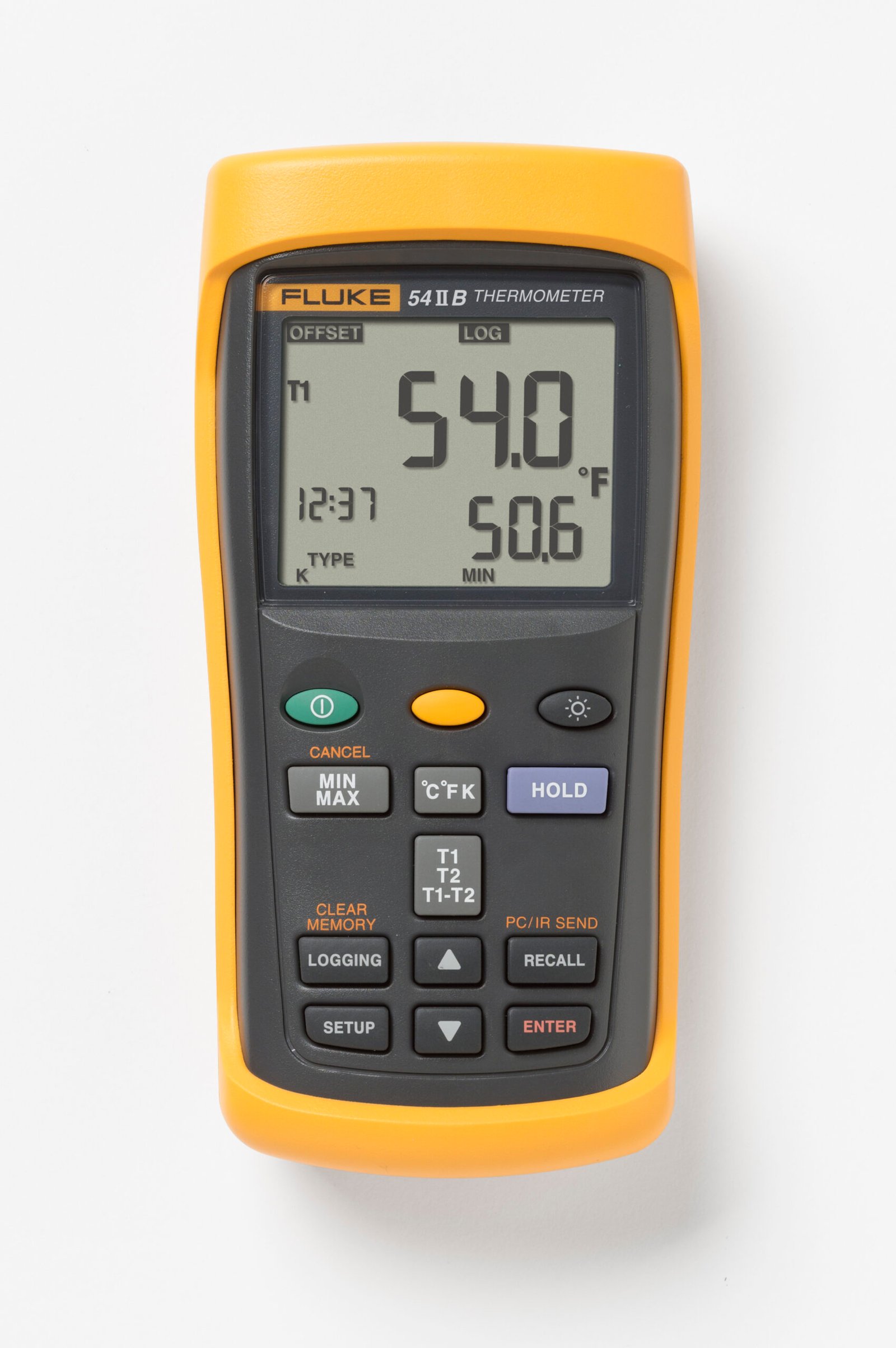 Fluke 54 II B dual input digital thermometer can log up to 500 points of data to internal memory. Fast response and laboratory accuracy (0.05% + 0.3 °C). Take contact temperature for checking motors, insulation, breakers, pipes, corroded connections, liquids, and wires with industrial standard J, K, T, E, N, R, and S type thermocouple (temperature sensors).
