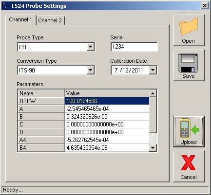 The Probe Settings dialog displays the information currently stored for the probe(s). If the instrument has more than one channel settings for the probes are displayed on the corresponding tabs. Changes made on the dialog are not written to the instrument until the Upload button has been clicked.