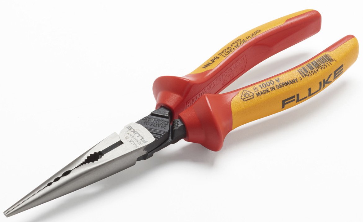 Fluke long nose insulated pliers include a side cutter plus a unique milled wave pattern for powerful gripping zones. There are 4 gripping points for pulling round objects without slipping. Forged from German chromium-molybdenum-vanadium (CMV) steel.