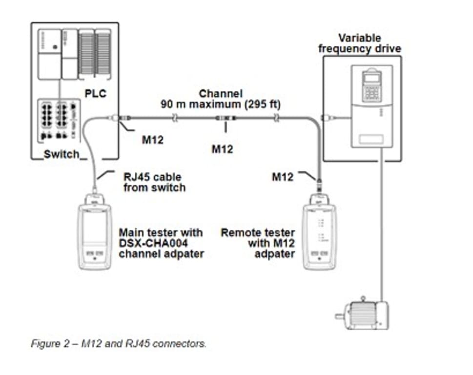 Channel (End to End) Test with M12 on One End and an RJ45 on the Other End – With one M12 Channel Adapter (D or X version) on the DSX CableAnalyzer and an RJ45 the Smart Remote, the DSX CableAnalyzer will accurately measure the performance of the entire cable and all intermediary connectors as illustrated in Figure 2. Note that the standards’ definition of the cable channel specifically excludes the connections to the tester at each end.
