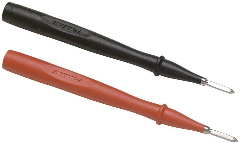 Safety designed probes with slender, Slim-Reach bodies and stainless steel tips. Effective for reaching closely-spaced deep test points or recessed terminals. All Slim-Reach probes are rated for 10 amps, and may be used in 1000V CAT III environments. Flat 1.78 mm x 2.79 mm (0.07 in x 0.11 in) blade designed to hold securely in blade type electrical wall sockets.