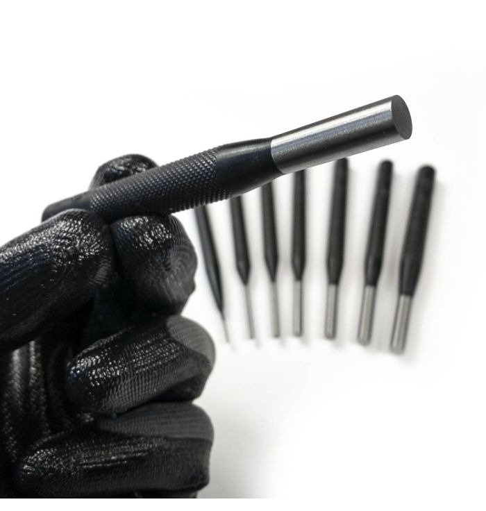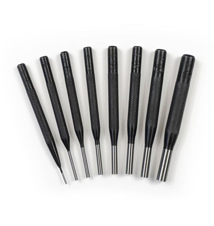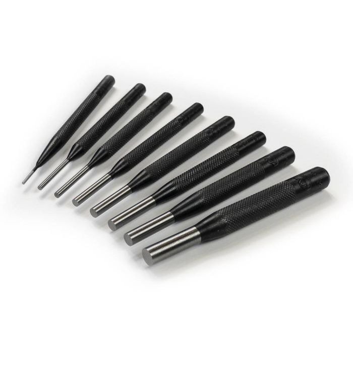 The #SPC75 4 In. Drive Pin Punches, Eight-piece Set is ideal for removing metal pins from holes in machine shops and motor service bays.