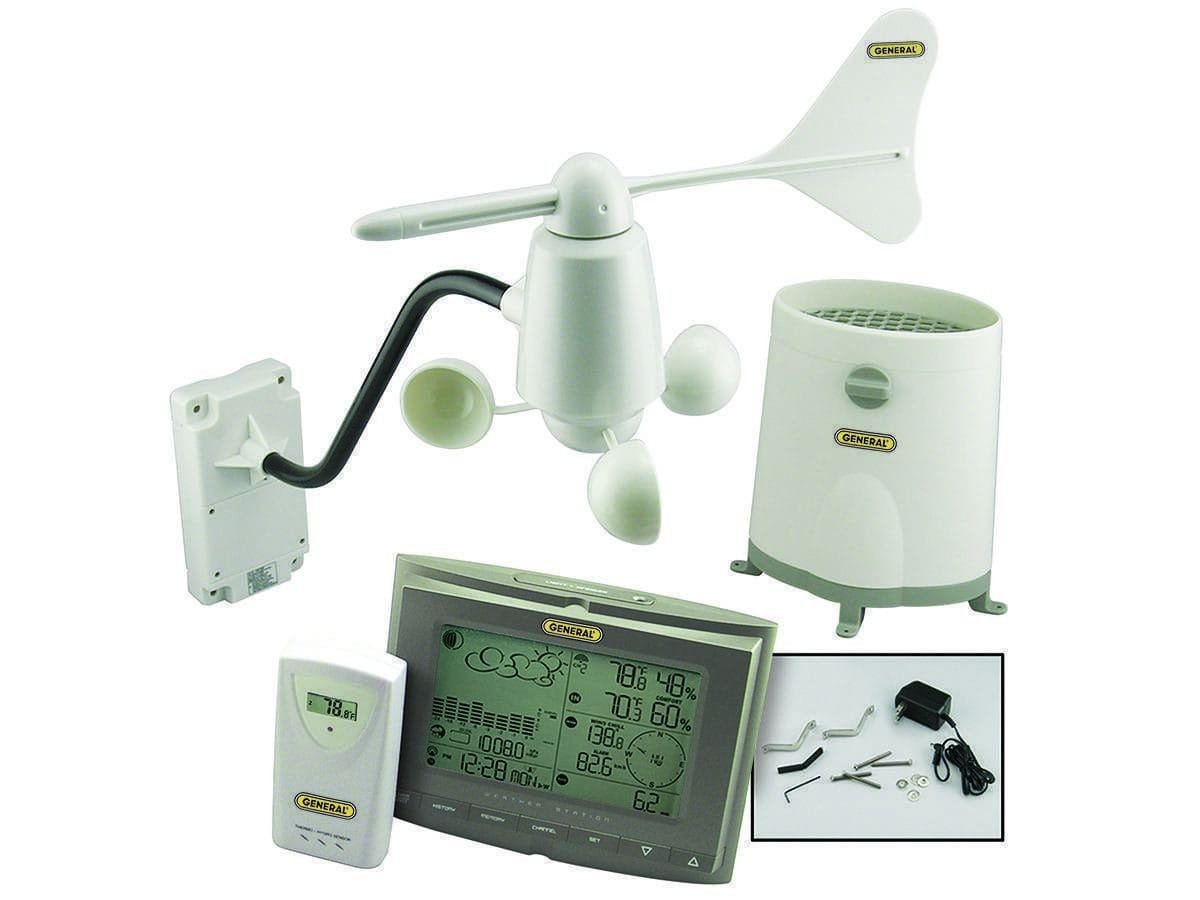 The #WS821 Wireless Weather Station is ideal for pro-am forecasters. It measures barometric pressure, rainfall, temperature, relative humidity (RH), and wind speed and direction. And its display station can receive temperature and RH readings from up to five wireless sensors located within 100 ft.