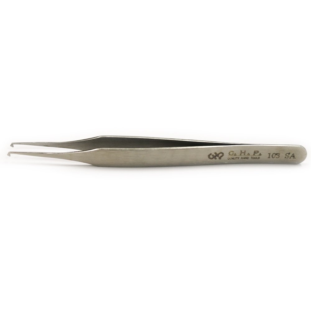 The Hakko 103-SA is a flat tip tweezers with angled tips for handling SOT packages horizontally. CHP tweezers are manufactured with high quality stainless, non-magnetic, antacid steels in a wide variety of tip shapes. They are ideal for delicate, precision assembly. Flat tip tweezers 1 mm wide for handling chips, SMDs, and SOT packages horizontally. Tips are bent for fatigue reduction.