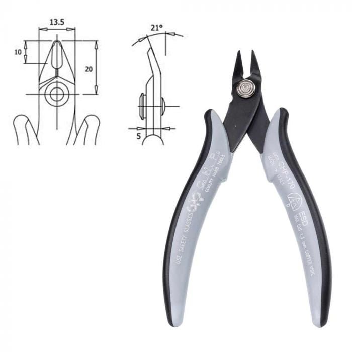Tool for a flush cut. One of the most popular cutting tools. A safety clip for holding wire scraps securely after cutting is available (order part number CHP-170-A.) Safety clip type AF.