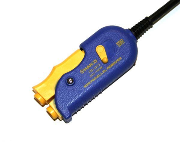The HAKKO FM-2023 Mini Hot Tweezer is designed for use with chip components as small as 0201. The FM-2023 has the unique feature of allowing it to work as a standard or reverse action. A simple flip of a switch sets the action of the tool.