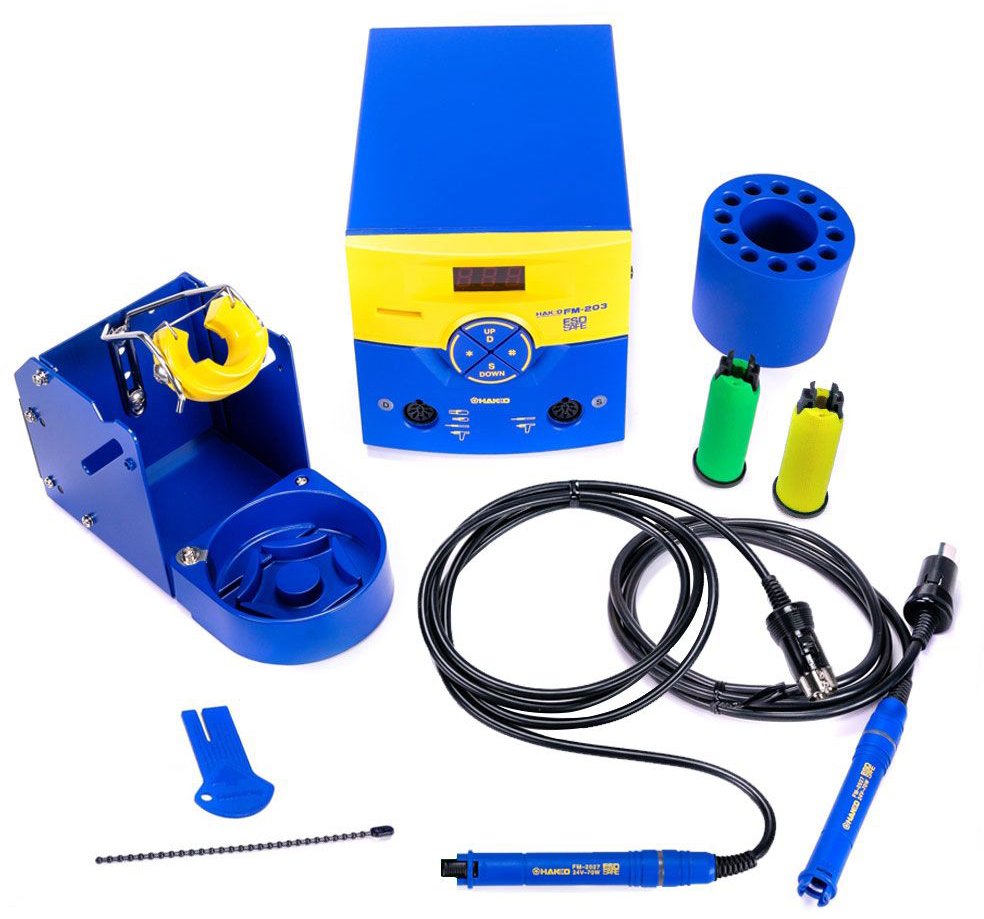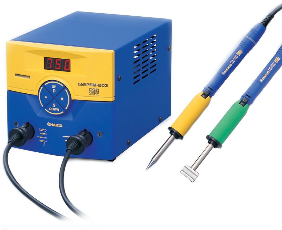 The Hakko FM-203 is a dual-port soldering station, delivering up to 140 watts of power. Built for versatility, the FM-203 is compatible with eight different irons and tweezers and features two channels that can be used simultaneously. This system has the power and flexibility to perform a variety of tasks from working with standard through-hole parts to fine-pitched surface mount components.