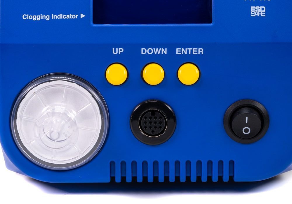 Suction starts 2/10 of a second after the trigger is pulled on the desoldering handpiece – this allows for a buildup of vacuum, which is then applied to the solder joint for instant high power vacuum and complete desoldering. An improved heater core allows increased heating at the back end of the heating core, ensuring molten solder is sucked into the filter pipe. After releasing the trigger the pump continues to run for an extended period of time, so that residual solder in the heater core is sucked all the way into the filter.