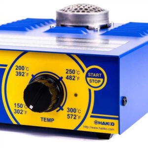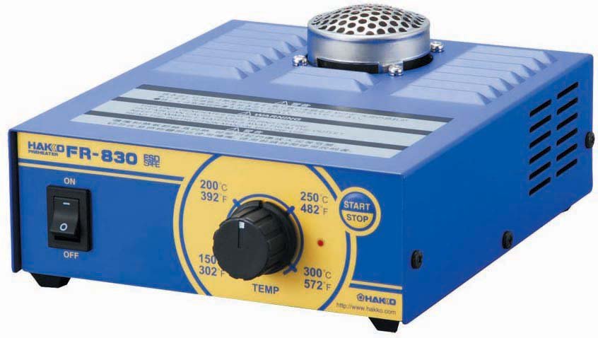 The HAKKO FR-830 Preheater is a compact and low cost solution for hot air preheating of printed circuit boards. The design of the FR-830 delivers consistent heat through the closed-loop temperature control allowing you to select a preheating temperature between 302°- 572 °F (150 °C – 300 °C). The new heater and fan design makes the HAKKO FR-830 the most durable hot air preheater HAKKO has ever made.