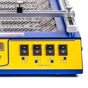 The Hakko FR872-03 4-Bank IR PCB Preheater has a low-profile bench top design and used to elevate the temperature of printed circuit board assemblies so that the components on them can be soldered and de-soldered more easily with improved results. It’s useful on medium to high-mass boards, which can heat-sink a significant amount of energy being supplied by a soldering iron tip or hand-held hot air tool and lead-free assemblies. This pre-heater uses high efficiency carbon filament IR heating lamps and has 4 independently controlled heating zones that cover a total of 8.8″ x 10.5″ for a large effective heating area.