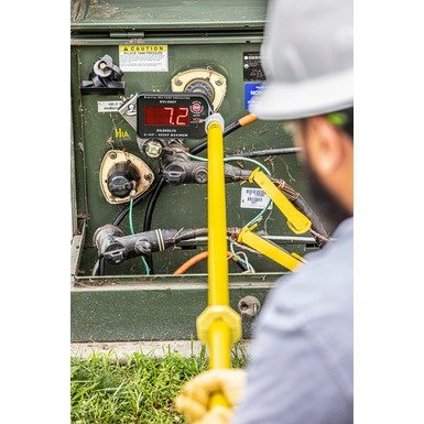 Indicates Voltage up to 500kV For use on system voltages up to 800kV (reads up to 500kV line-to-ground). No range selector switch or settings are required. The large LED display indicates the line-to-ground voltage level Display is easy to read in bright or dark conditions. Voltage readout allows the user to distinguish between nominal and induced voltages Audible indication when voltage is detected Measure elbow test points with the DVI-500T Built-in universal spline for standard hot stick attachment Built-in self-test to verify proper operation Auto shutoff with low battery function Powered by a field-replaceable 9V lithium or alkaline battery Compact, rugged and lightweight polycarbonate housing Kits are available, contact factory for details.