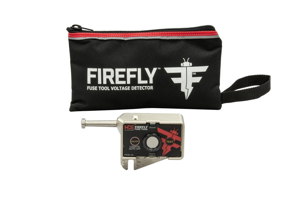 The FireFly Fuse Tool Voltage Detector, model FTVD-15, combines a fuse tool, voltage detector and spotlight in one single product, saving time and adding an extra level of safety while working on distribution lines. The voltage detection function will check for voltage on the line – red LEDs will flash and an audible alarm is activated when voltage is detected. Then use the Fuse Tool function to open and close the fuse or switch. Bright white spotlights located on both the top and front of the tool will provide illumination at night or in the dark for better visibility and added safety. Get the work done three times as fast with the FireFly Fuse Tool Voltage Detector!