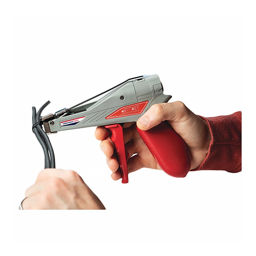 The HellermannTyton 110-09980 MK9 is an ergonomic tool designed for versatile use, requiring extremely low maintenance. It features an adjustable preset tension device and is capable of tensioning and automatically cutting HellermannTyton cable ties up to 4.8 mm wide. With its lightweight design, ergonomic handling is ensured, further enhanced by its housing made of resilient and lightweight glass fibre-reinforced polyester. Notably, the MK9 holds MIL approval, solidifying its reliability and quality.