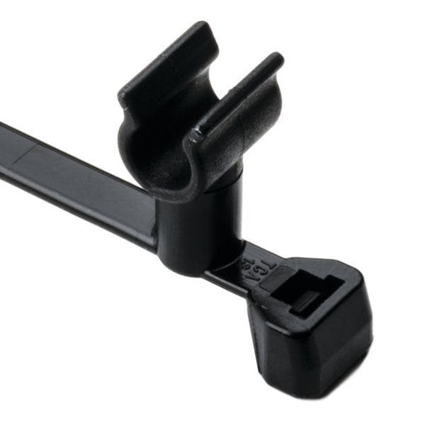 The HellermannTyton 156-01516 1-Piece Cable Tie with Pipe Clip secures cables to tubular frame rails. The cable tie bundles wires, cables, or tubes, and the C-clip snaps onto the tubular frame rail. The clip can be removed from the mounting surface and reinstalled without additional fasteners.