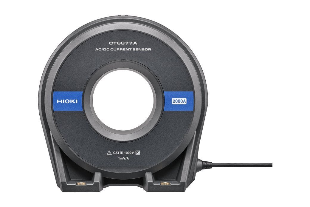 The Hioki CT6877A has a frequency bandwidth of DC to 1 MHz and a rated current of 2000 A. It is used for R&D, quality evaluation, manufacturing, and maintenance in markets such as wireless charging systems, inverter motors for industrial equipment, power conditioners for PV, and quick charging facilities for EVs.